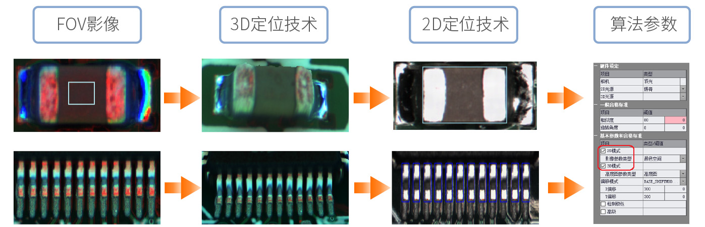 3DAOI采用3D本體定位技術(shù),2D定位技術(shù)作為輔助,保證Chip 與IC等元器件的本體與PIN腳定位準(zhǔn)確及黑色等特殊元器件的本體定位準(zhǔn)確。